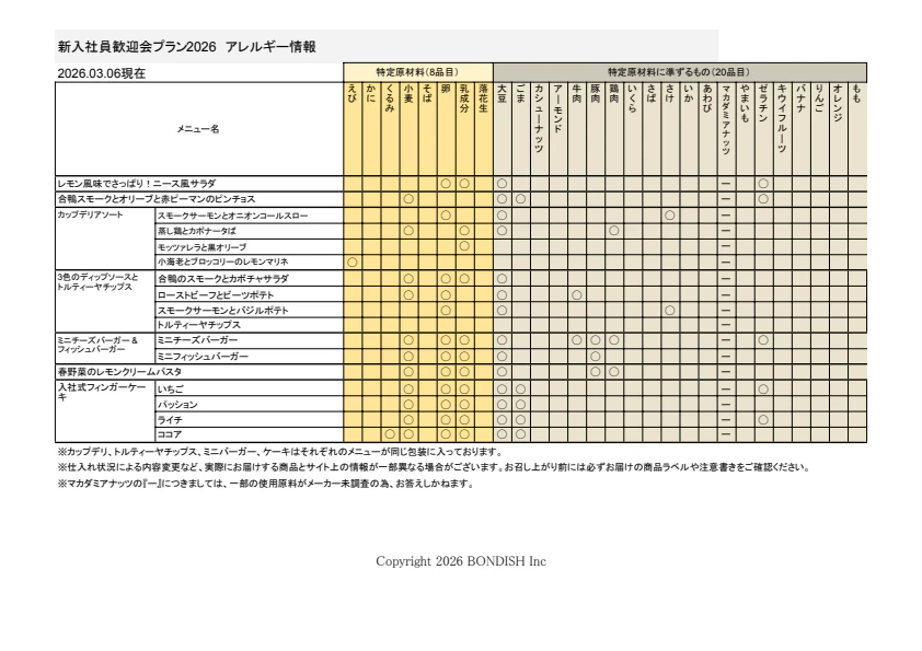 アレルギー (特定原材料8品目、特定原材料に準ずるもの20品目)